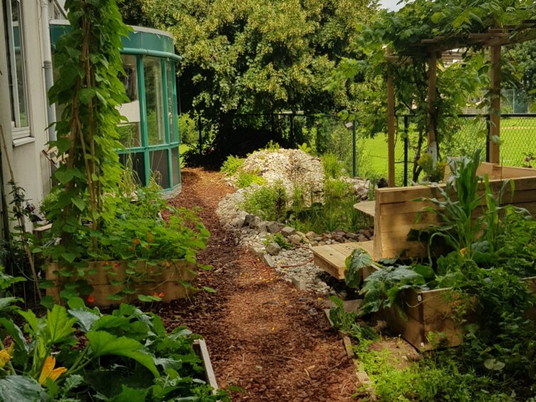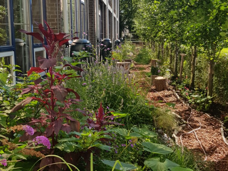 Inmiddels zijn vele stoeptegels en stukken gras vervangen door bloemborders (voor de honingbijen op school, maar uiteraard ook voor overige insecten, vogels, amfibieën, knaagdieren...) met zitjes en paden van boomschors. Er is een vijver met beekloop gemaakt en een bank annex vlonder gebouwd (waterdiertjes bestuderen!) en er zijn 4 moestuinbakken, 3 composthopen en een rots- en kruidentuintje aangelegd . Er zijn een tiental grote en kleine regentonnen aangesloten op de regenpijpen. Er staat een kas en er zijn koude bakken en oppottafels gemaakt om te onderwijzen in (moes) tuinieren. Er is een succesvolle bollenplantmiddag gehouden met leerlingen en collega's. Een buitenleerplek en dierenhotels zijn in de maak. En er liggen nog meer plannen op de plank (verticale tuin maken, fruit- en notenbomen planten, nog meer plekken rondom school vergoenen, de buurt betrekken bij onze projecten). De gemeente Den Haag voorziet ons in materialen (gekapte populieren voor de boomstamzitjes), educatie (boeken, posters, wildcamera, kennis tijdens v.b. bijeenkomsten) en subsidie. Leerlingen van Praktijkschool de Einder hebben ons geholpen met het begin van de tuinaanleg in de vorm van een stage. Een bedrijf biedt gratis compost aan, vrijwilligers (binnen en buiten school) helpen mee in de realisatie.