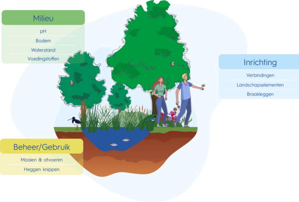 • De abiotische condities zoals hydrologie (= water), geomorfologie (= fysische kenmerken van het landoppervlak), bodemtype en nutriëntenbalans.