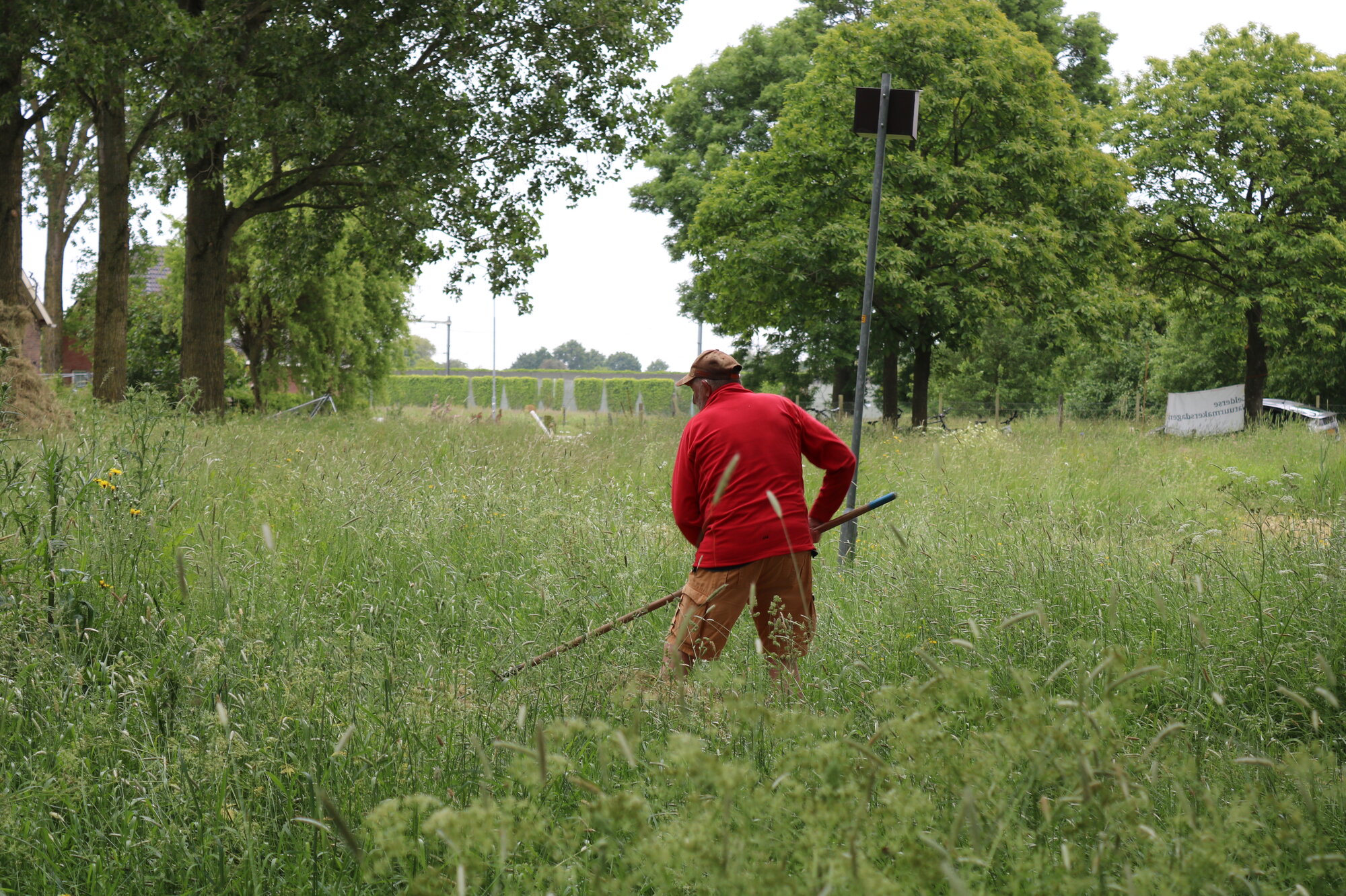 Als we het gebied benaderen zijn de vrijwilligers van de werkgroep al hard aan het werk met het harken en verzamelen van maaisel. Rieny Putmans en Gerrit Kolenbrander verwelkomen ons en vertellen over de geschiedenis en de werkzaamheden van de werkgroep. Voorheen werd het gebied gebruikt om drijfmest uit te rijden, maar vanaf februari 2022 zetten 29 enthousiaste vrijwilligers zich actief in om de natuur in het gebied te herstellen. Samen met de gemeente zijn er plannen gemaakt voor het gebied, dat midden tussen twee nieuwbouwwijken ligt. Door de inzet van de werkgroep is de Plak inmiddels uitgegroeid tot een biodiverse, groene plek die gonst van het leven.