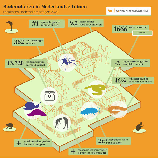 In heel Nederland gingen weer meer mensen op bodemdierensafari deze herfst. Wel 1666 officiële waarnemers ontdekten samen hoe het met ons bodemleven gaat. Van scoutinggroep tot verpleeghuis, van tuinliefhebber tot voedselboseigenaar. In totaal vonden zij meer dan 13.000 bodemdieren. En allemaal ontvingen zij een cijfer voor het bodemleven in de eigen tuin of omgeving.