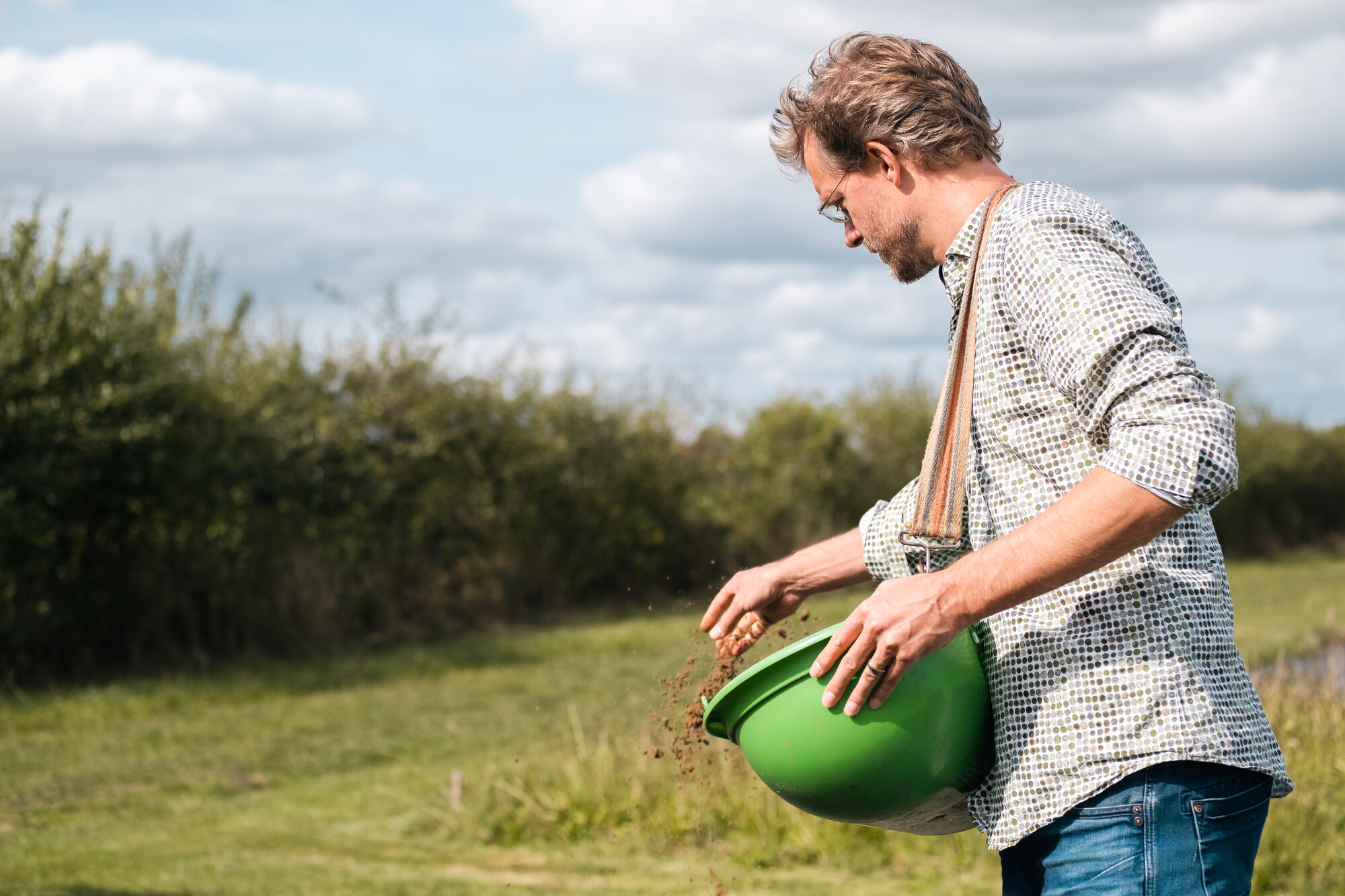 Na de rondleiding was het tijd om samen aan de slag te gaan. Jasper had een aantal zaaivelden voorbereid, die de groep met verschillende inheemse mengsels mocht inzaaien. Ook vertelde Jasper over verschillende zaaitechnieken die zorgen voor een beter en kleurrijker eindresultaat. Hiermee bracht de groep de belangrijkste les van de dag meteen in de praktijk: niet alleen praten en plannen maken, maar ook doen!